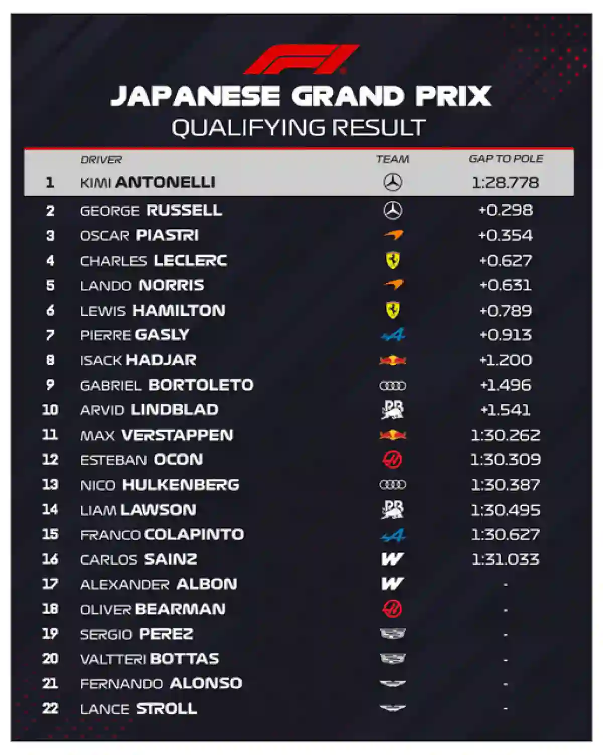 Andrea Kimi Antonelli largará desde la pole en la carrera principal del Gran Premio de Japón de este domingo. Mercedes volvió a quedarse con el 1-2, con George Russell ubicándose en la segunda colocación. Oscar Piastri y Charles Leclerc comenzarán en la segunda fila.