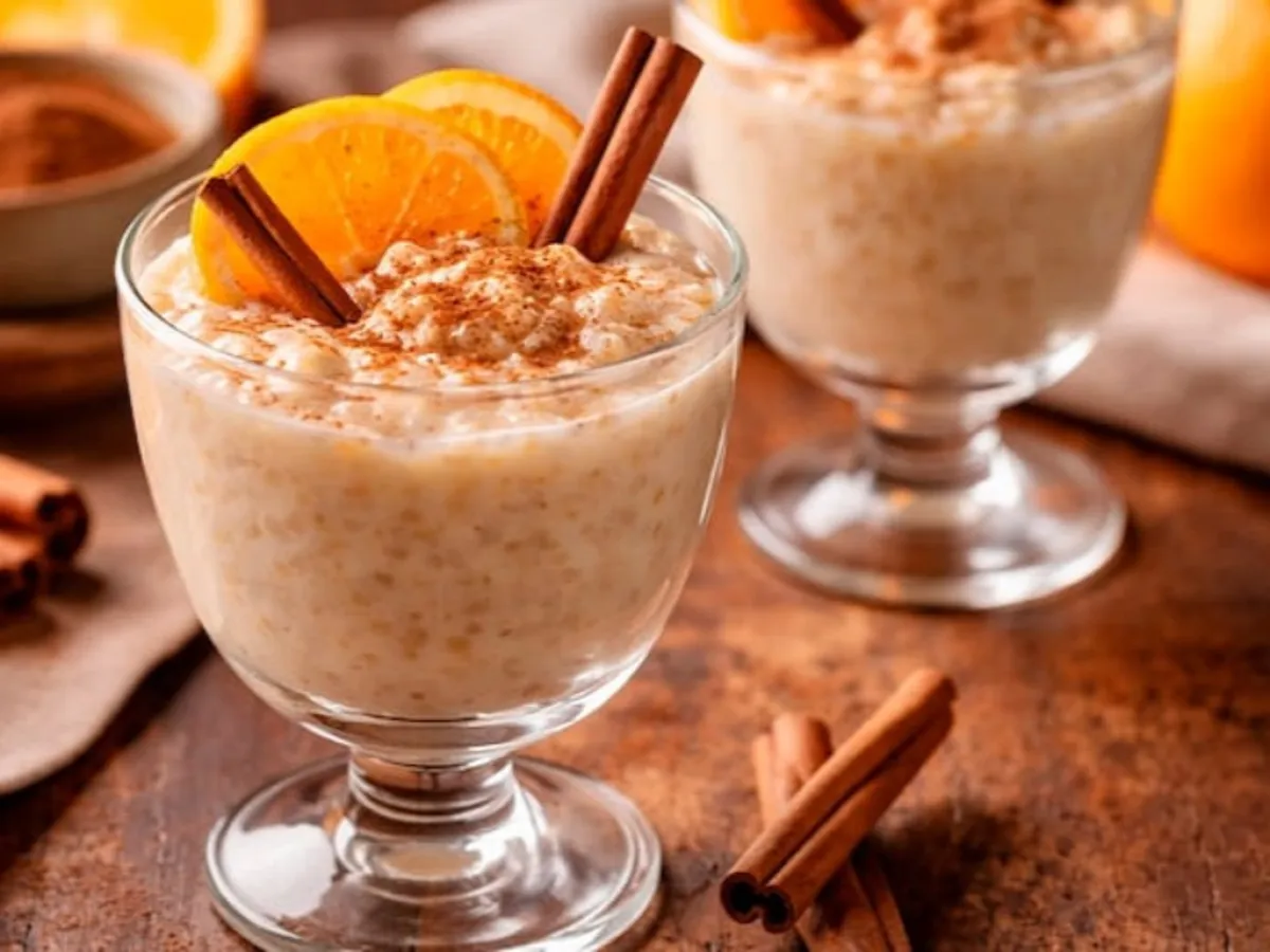 Presentación en copas y terminación clásica: Servir el arroz con leche en copas individuales y decorar con rodajas finas de naranja y una ramita de canela. Si se desea, sumar una pizca de canela en polvo al momento de llevar a la mesa.