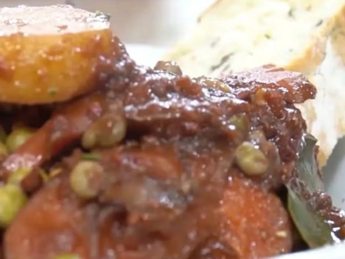 El plato se complementa con papas en rodajas que se cocinan en esa salsa potente junto a arvejas frescas. Todo eso se cuece lento, bajando el fuego para que los sabores se amalgamen, la carne quede tierna, y la salsa tome cuerpo.