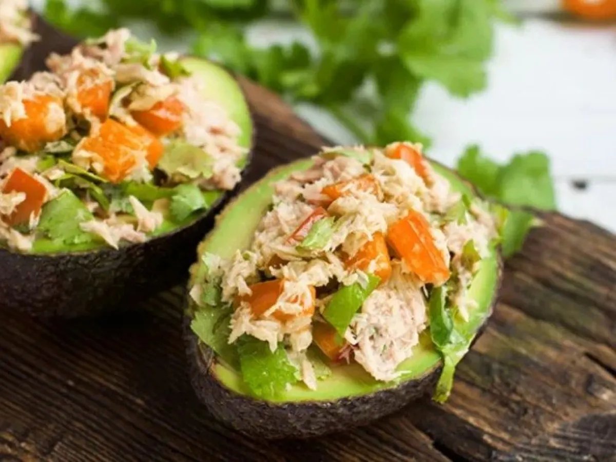 Una vez lista la ensalada, el siguiente paso es rellenar las mitades de palta. Tomás las cuatro paltas cortadas y sin el carozo, y las rellenás con la mezcla de atún preparada.