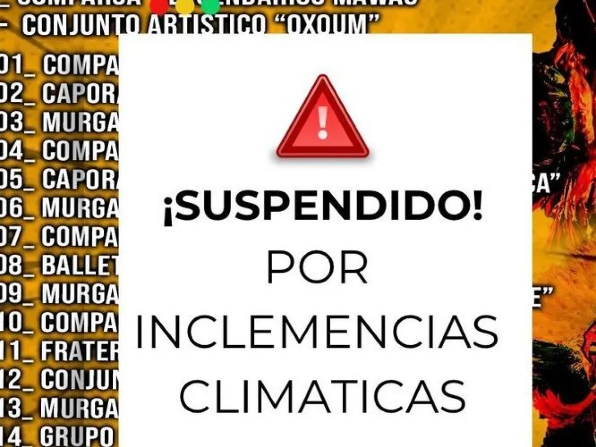La jornada suspendida incluía la presentación de comparsas, murgas, ballets, conjuntos artísticos y agrupaciones invitadas que forman parte del cronograma oficial. Ante el pronóstico de precipitaciones intensas y condiciones meteorológicas adversas, los organizadores decidieron tomar la medida de manera preventiva.