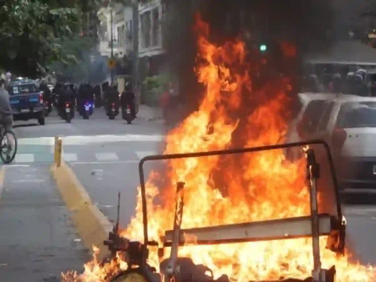 Con el correr de los minutos, la confrontación se intensificó. Se registraron lanzamientos de botellas y bengalas, intentos de remover vallas del operativo y focos de fuego que fueron apagados por los hidrantes. Las autoridades señalaron que los detenidos habrían protagonizado agresiones contra efectivos y provocado daños en el espacio público.