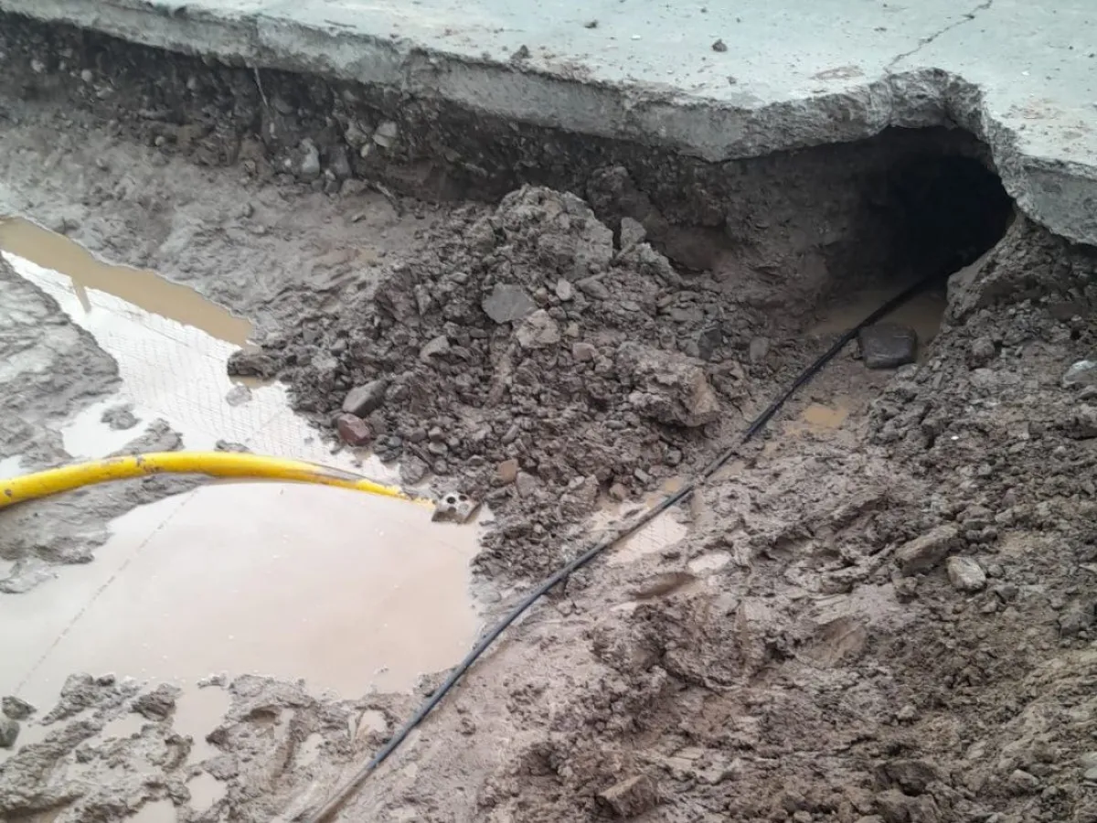 Durante el desarrollo de los trabajos, se constató que el origen del problema fue una importante pérdida en un caño perteneciente a Aguas del Norte, la cual provocó el socavamiento del terreno y el vaciamiento de la losa de hormigón, generando un riesgo estructural grave para quienes transitan por esta arteria de alto flujo vehicular.
