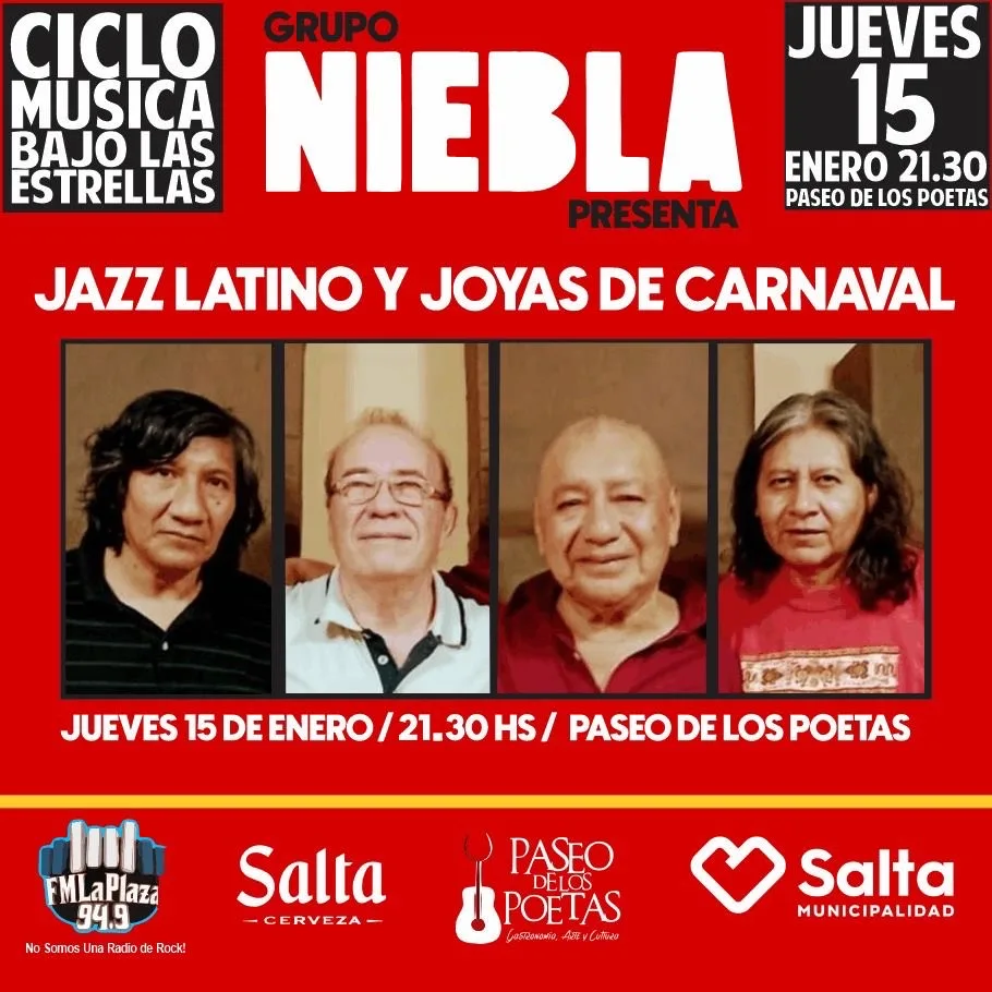 En el marco del ciclo “Música Bajo las Estrellas”, hoy, jueves 15 de enero a las 21:30 hs, el Paseo de los Poetas será escenario de una velada especial con la presentación del Grupo Niebla, que ofrecerá un repertorio de jazz latino y joyas de carnaval.