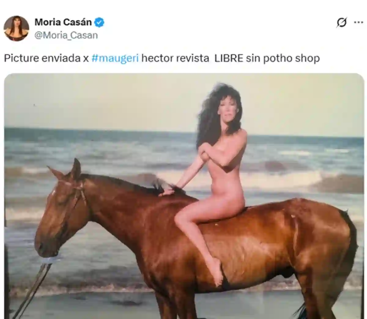 La fotografía, rescatada del archivo de la revista Libre por el periodista Héctor Maugeri, muestra a Moria desnuda, sobre un caballo y en una playa. La postal, cargada de sensualidad y fuerza estética, fue tomada en 1984, cuando la artista estaba en pareja con el actor y humorista Mario Castiglione, padre de su hija Sofía Gala. En ese entonces, Moria encabezaba la obra La mejor revista de la cuadra en el Teatro Estrella, en plena época dorada del teatro de revistas porteño.