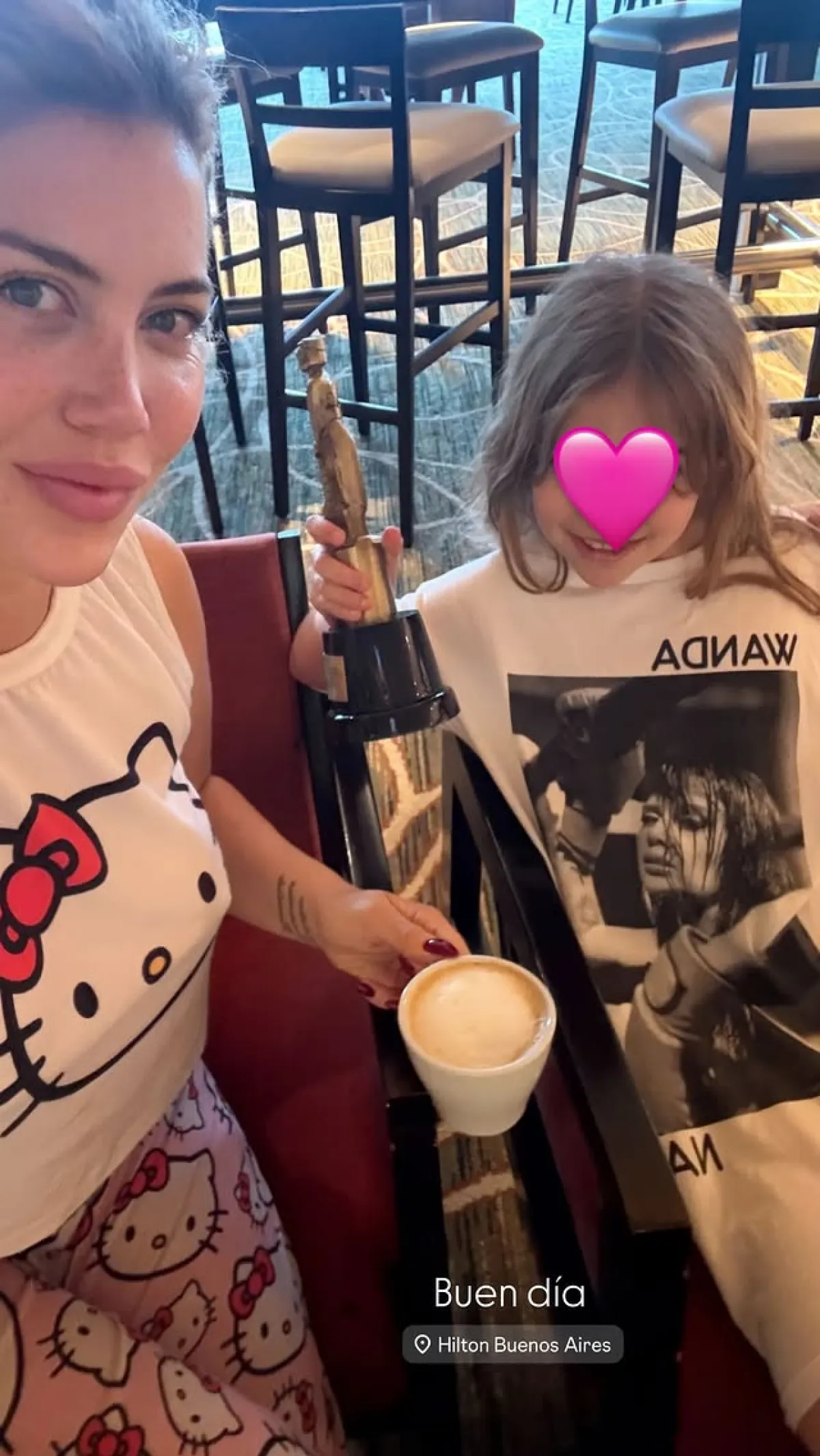 La imagen compartida en sus redes muestra a Wanda recién levantada, envuelta en sábanas blancas, con el galardón dorado a su lado sobre la cama. Su rostro sin maquillaje y el entorno relajado contrastan con el glamour de la gala nocturna, ofreciendo una postal que combina ternura, autenticidad y orgullo. En otra fotografía, aparece junto a su hija Isabella, quien sostiene la estatuilla mientras luce una camiseta con la cara de su madre y la palabra “Wanda” impresa. Ambas disfrutan del desayuno en el hotel, en un momento que resume el apoyo familiar detrás del éxito profesional.