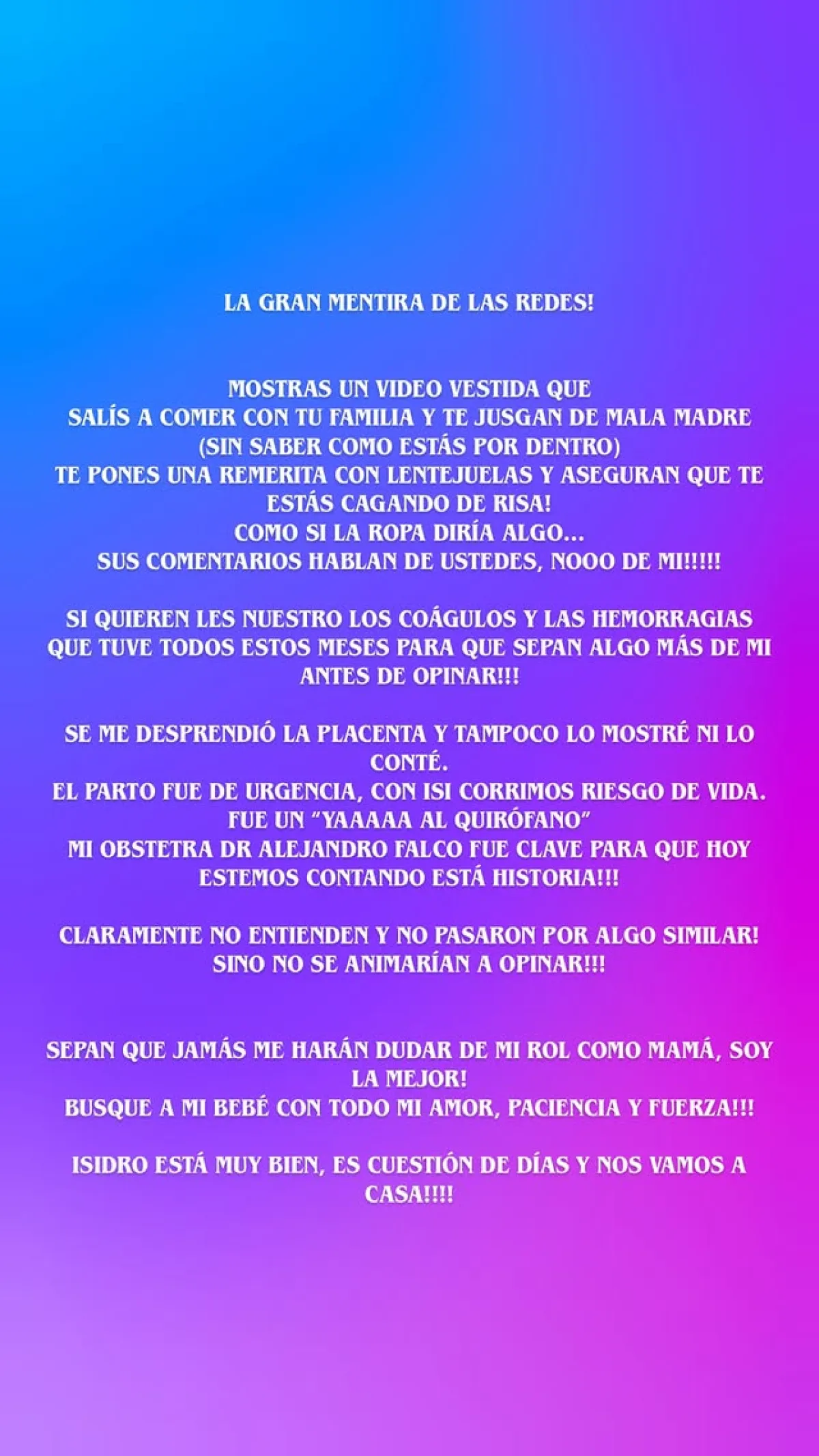 La modelo señaló que las redes sociales suelen mostrar una “gran mentira”, ya que se juzga a las personas por una imagen sin conocer lo que ocurre en su interior. En su descargo, explicó que salir a cenar no significa desatender a su hijo, sino darse un respiro en medio de un proceso complejo. Además, destacó que comparte cada avance en la salud de Isidro y que su prioridad es acompañarlo en todo momento.