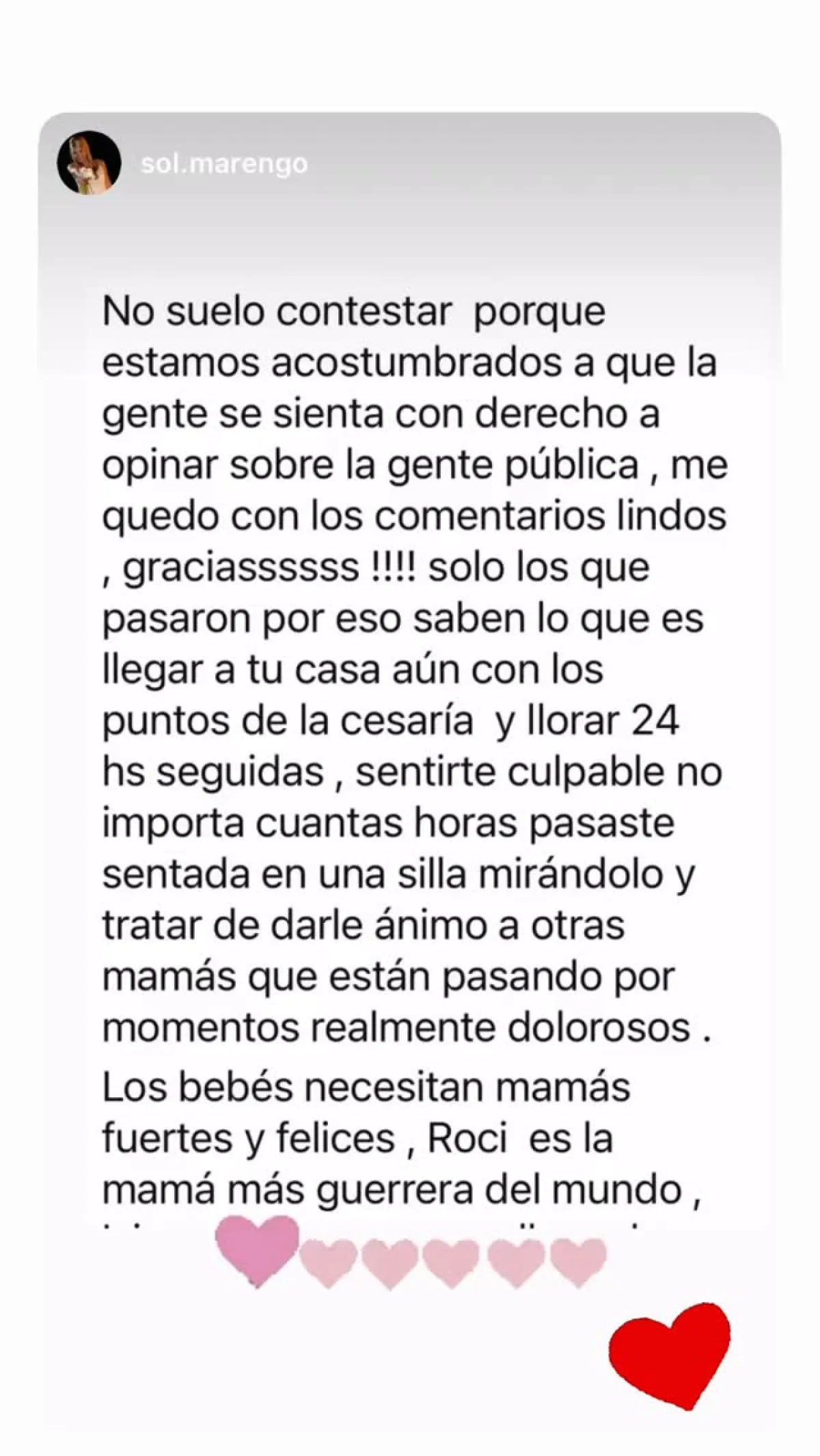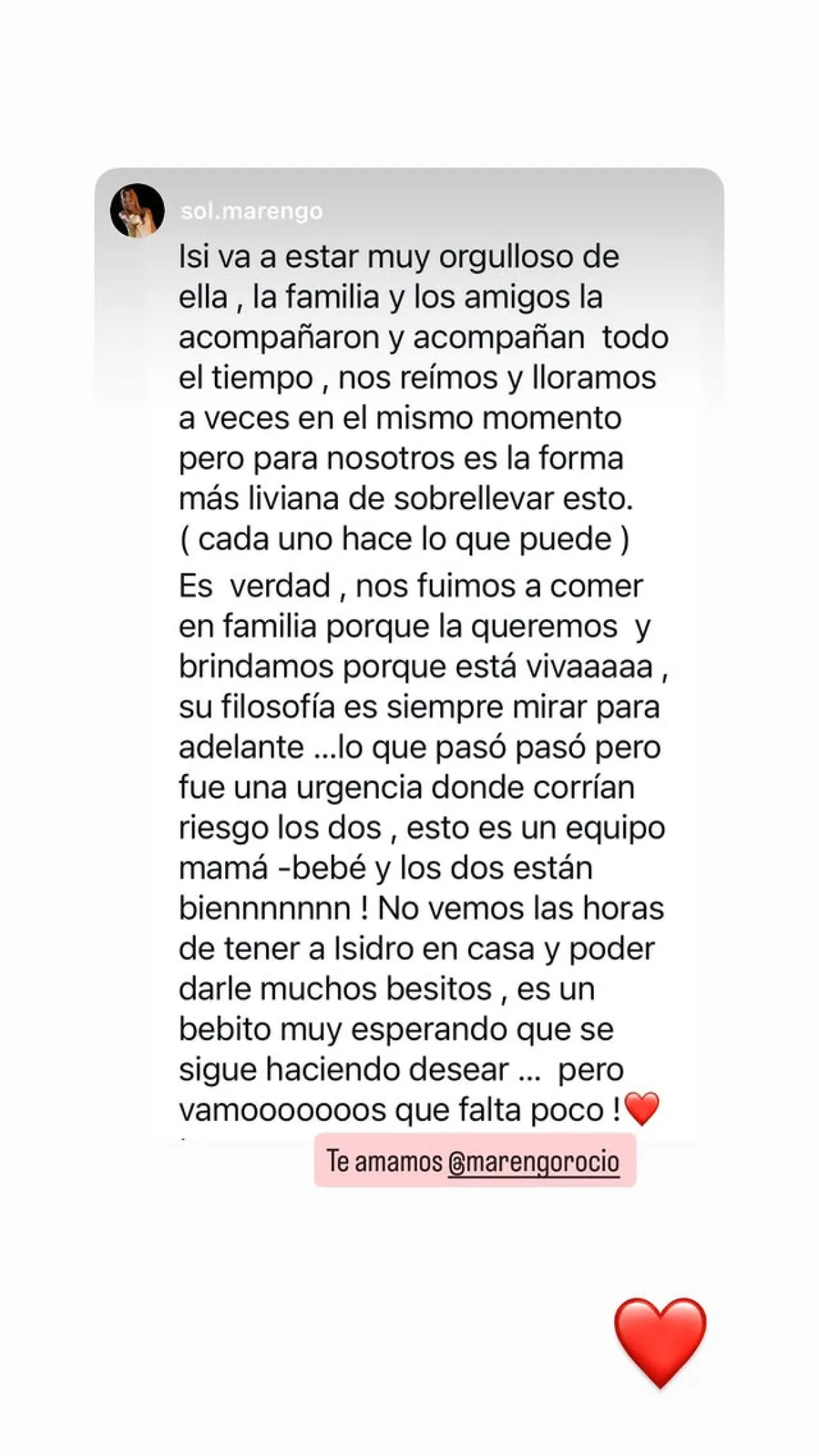 En plataformas como Instagram, varios usuarios la acusaron de “mala madre” por mostrarse arreglada y disfrutar de una cena mientras su hijo seguía internado. Rocío, lejos de guardar silencio, eligió responder con firmeza. “Jamás me harán dudar de mi rol”, expresó, subrayando que su compromiso con Isidro es absoluto y que nadie conoce mejor que ella el esfuerzo y la entrega que implica atravesar la maternidad en circunstancias tan delicadas.